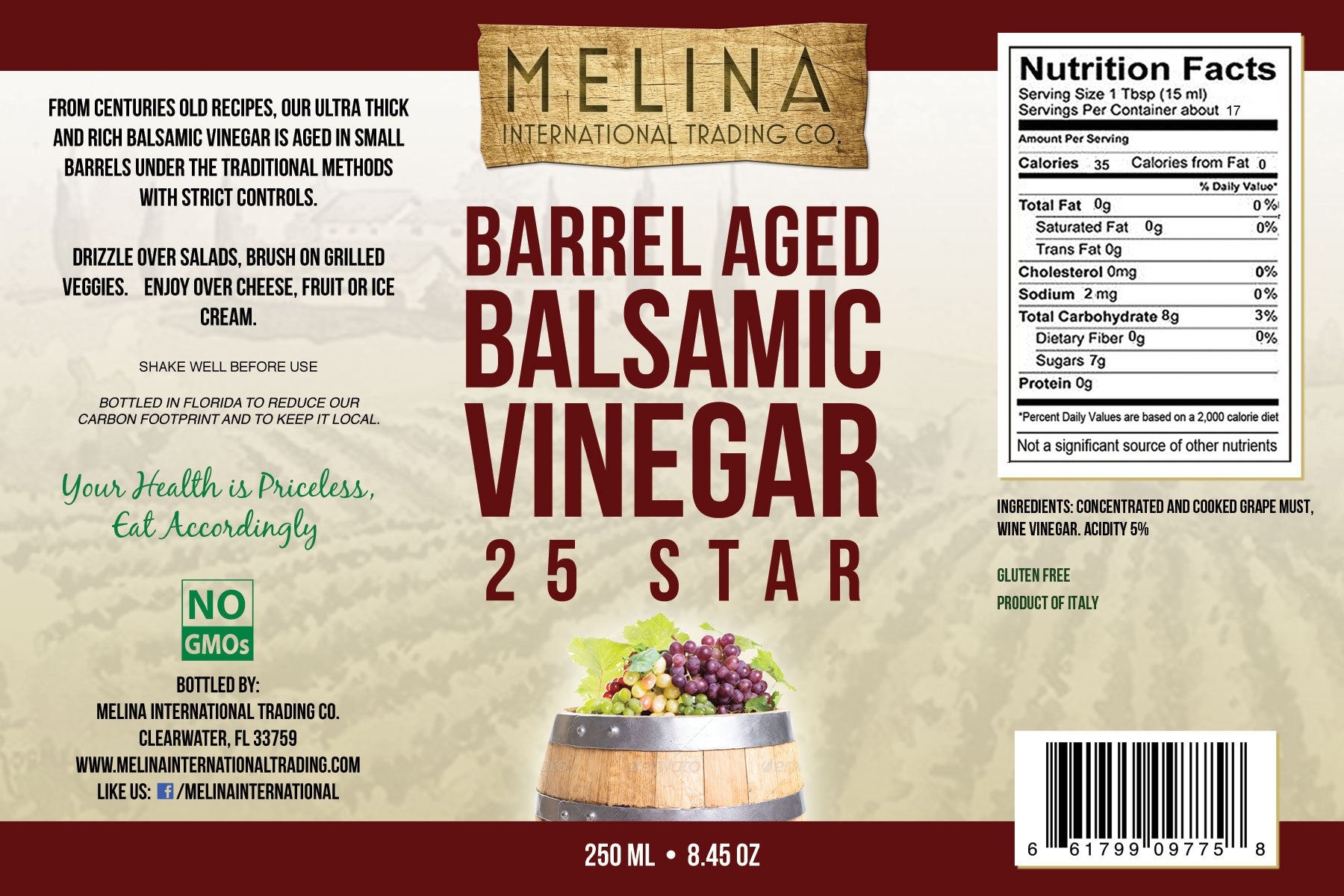 Move out of the way for the best balsamic vinegar on the market, Melina’s 25 star balsamic vinegar! Our 25 star balsamic vinegar is made in Modena, Italy, by aging in barrels from classical techniques. If you want a refined taste of Italy, this is for you!